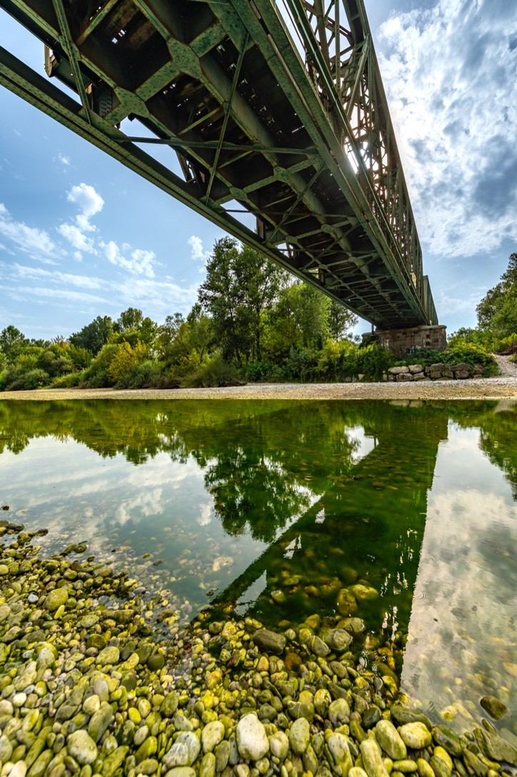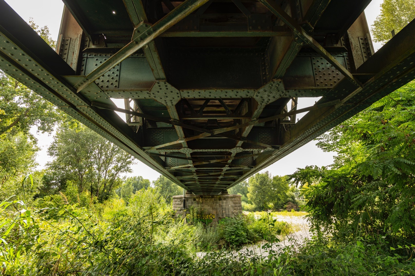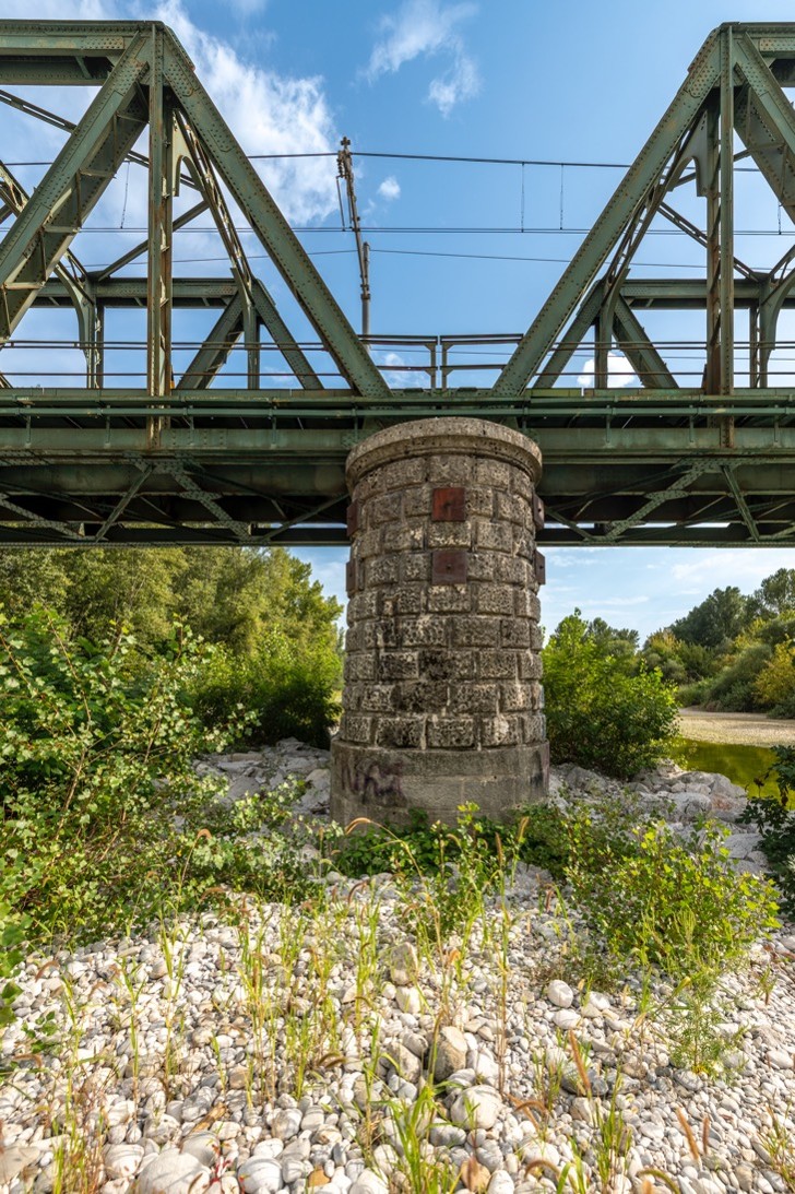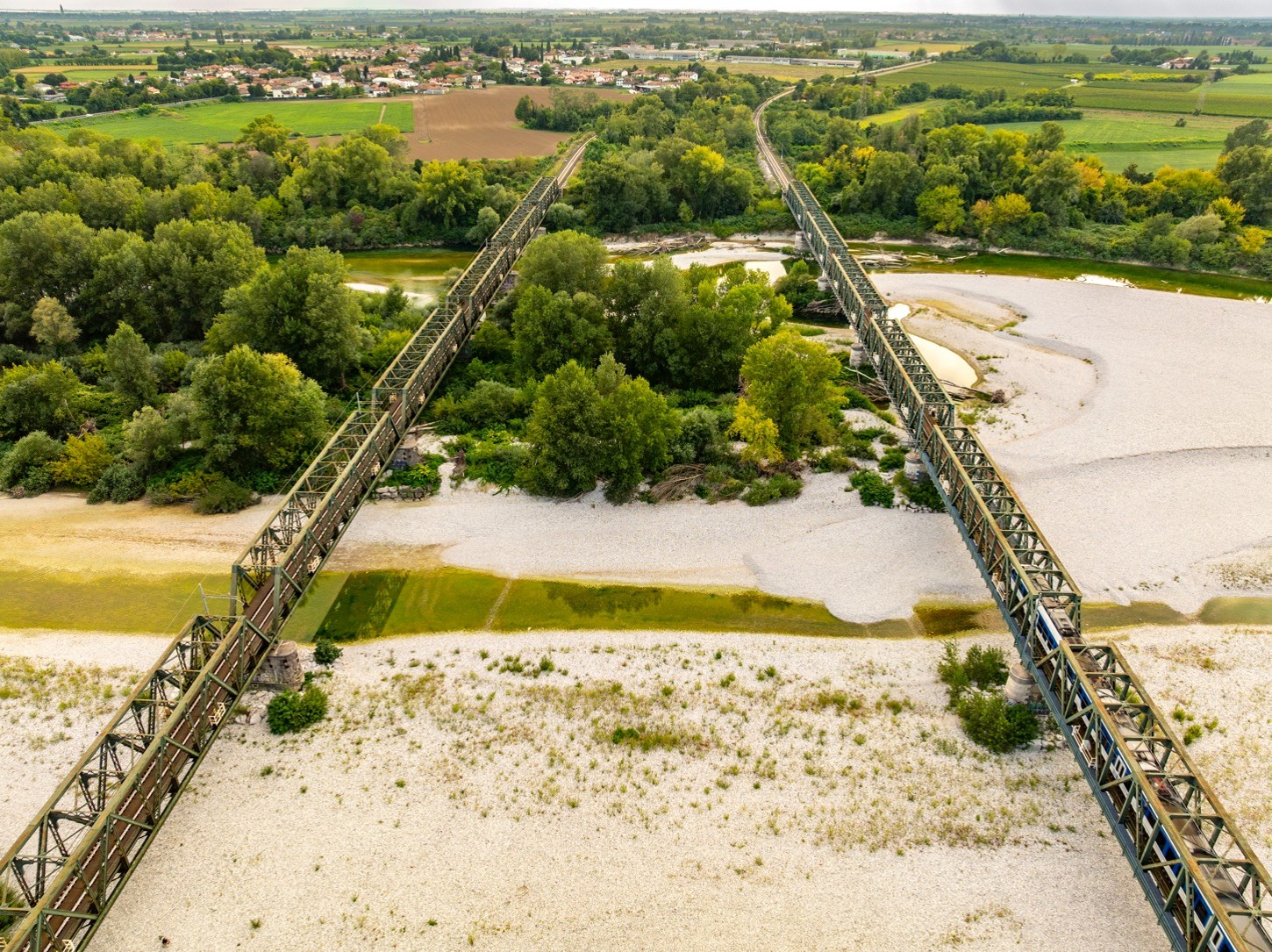 Between the mid-1800s and the end of the 19th century, railway routes in the Princely County of Gorizia—including those connecting Vienna with Trieste—were significantly impacted by the new connection to Venice in the Kingdom of Italy (1866). These changes affected both the territory and its inhabitants. Historical information about the Pieris Railway Bridge remains scarce, though what survives is fascinating. In its inaugural article of 12 June 1894, the local newspaper Il Corriere di Gorizia declared it “a colossal work, the most important structure of the railway line”. It noted its cost at “750,000 florins”. The engineering documentation available reveals the considerable technical challenges encountered during construction. Project engineers Giulio Dreossi and Giacomo Antonelli reported that initial progress was impeded by drought conditions, followed by adverse weather and flooding. Despite these obstacles, the Pieris Bridge—which carries the new railway line—remains the only major iron structure built as part of this railway infrastructure.