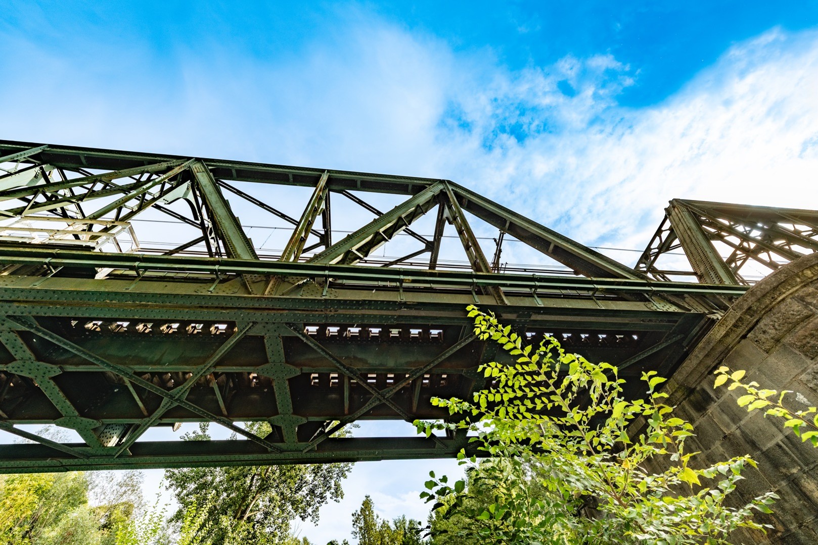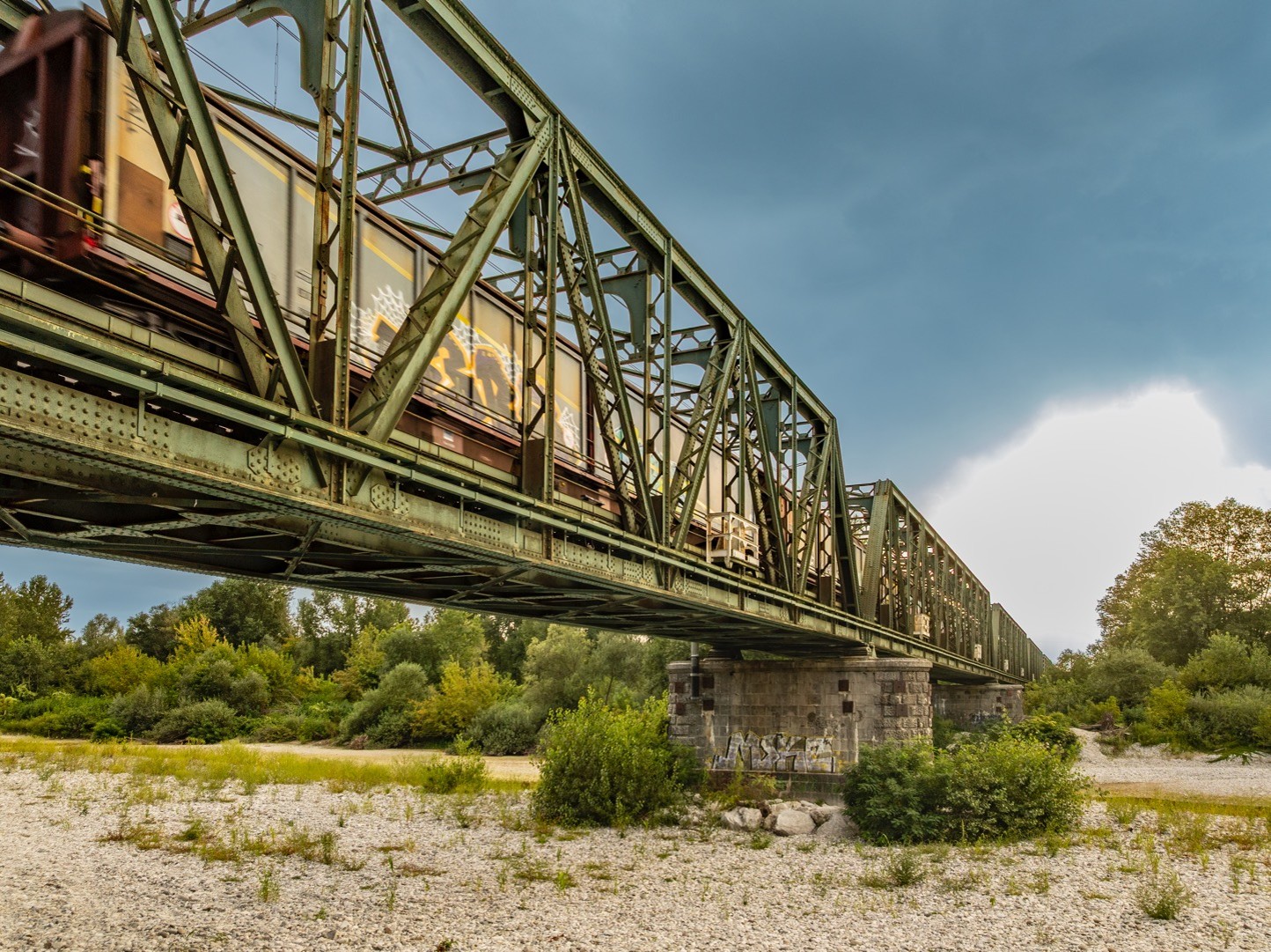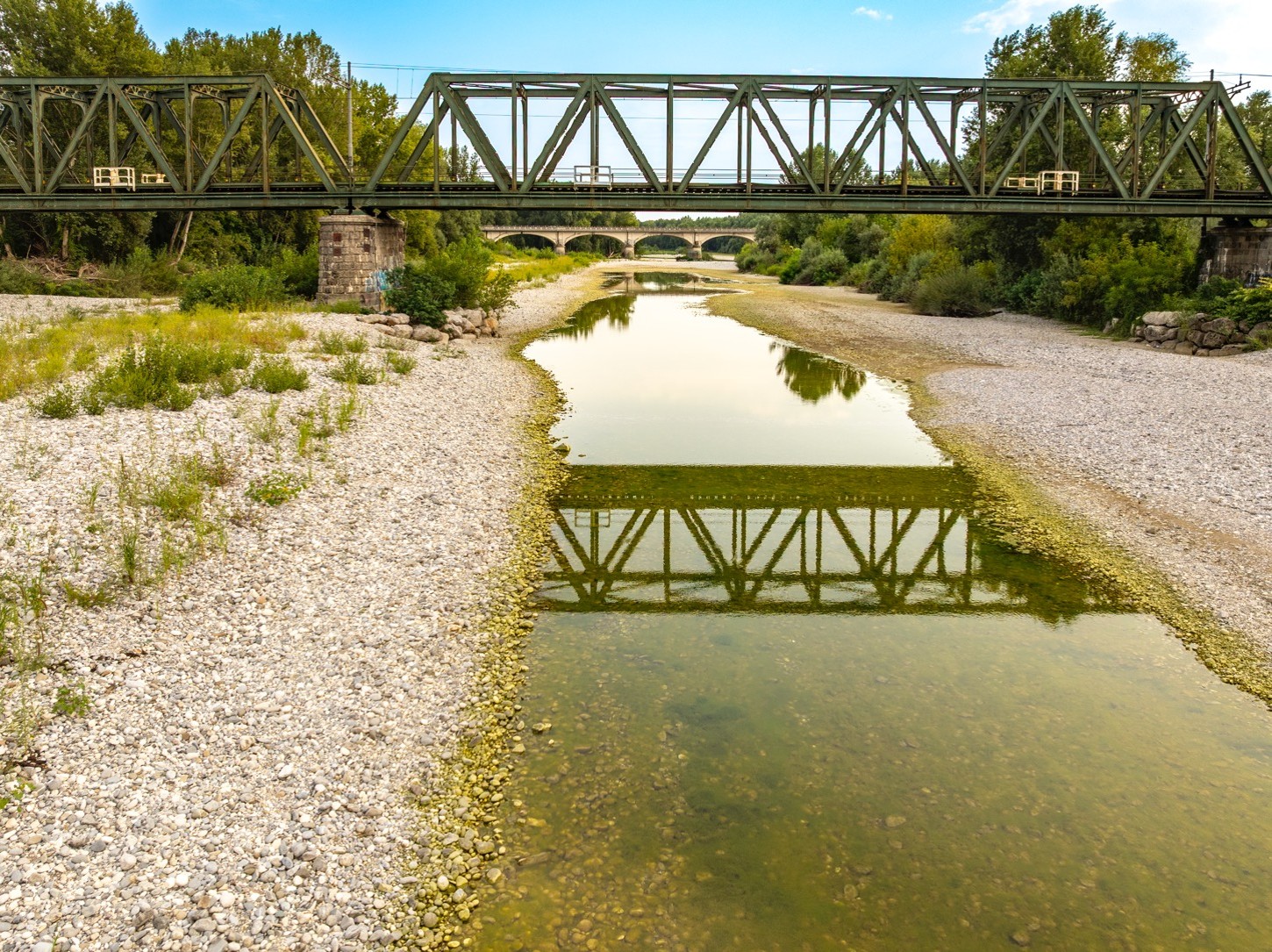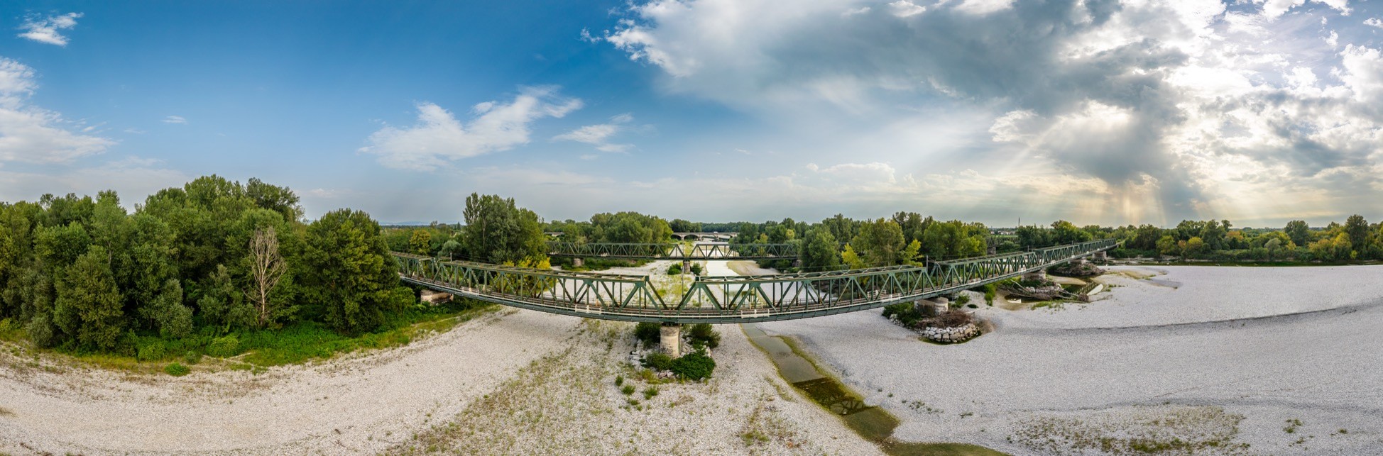 Between the mid-1800s and the end of the 19th century, railway routes in the Princely County of Gorizia—including those connecting Vienna with Trieste—were significantly impacted by the new connection to Venice in the Kingdom of Italy (1866). These changes affected both the territory and its inhabitants. Historical information about the Pieris Railway Bridge remains scarce, though what survives is fascinating. In its inaugural article of 12 June 1894, the local newspaper Il Corriere di Gorizia declared it “a colossal work, the most important structure of the railway line”. It noted its cost at “750,000 florins”. The engineering documentation available reveals the considerable technical challenges encountered during construction. Project engineers Giulio Dreossi and Giacomo Antonelli reported that initial progress was impeded by drought conditions, followed by adverse weather and flooding. Despite these obstacles, the Pieris Bridge—which carries the new railway line—remains the only major iron structure built as part of this railway infrastructure.