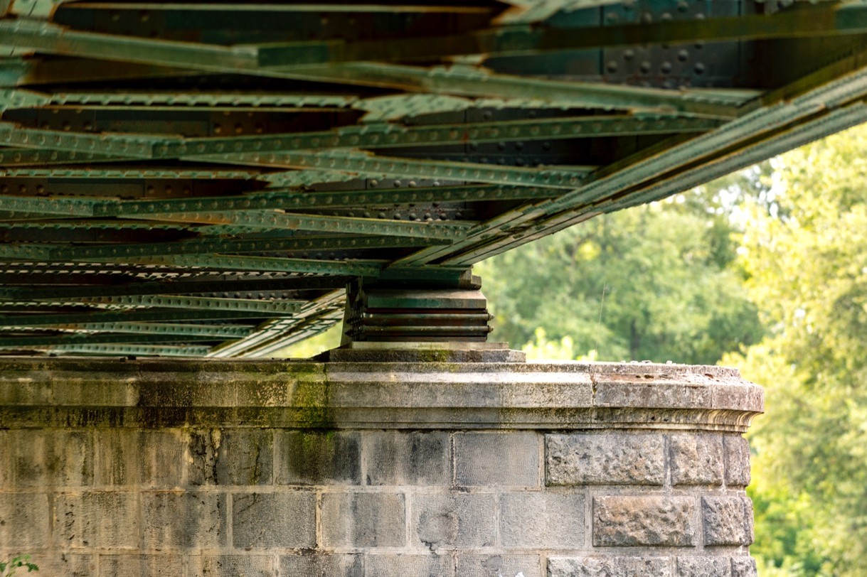 The bridge consists of two parallel and structurally independent structures, comprising seven spans measuring 52.50 metres in total length. Each span features a combination of straight lower chords and parabolic upper chords, which results in varying structural heights. The truss system employs vertical members consisting of posts and diagonal supports. Horizontal bracing and cross-beams integrate the structure, providing support for the stringers—substantial longitudinal beams that accommodate the railway tracks.The bridge’s abutments and piers are built from limestone blocks. The piers have a unique cross-section design—semicircular on the downstream side and pointed-arch shaped on the upstream side—specifically engineered to deflect the Isonzo River’s flow. The structure is anchored by substantial concrete foundation blocks.