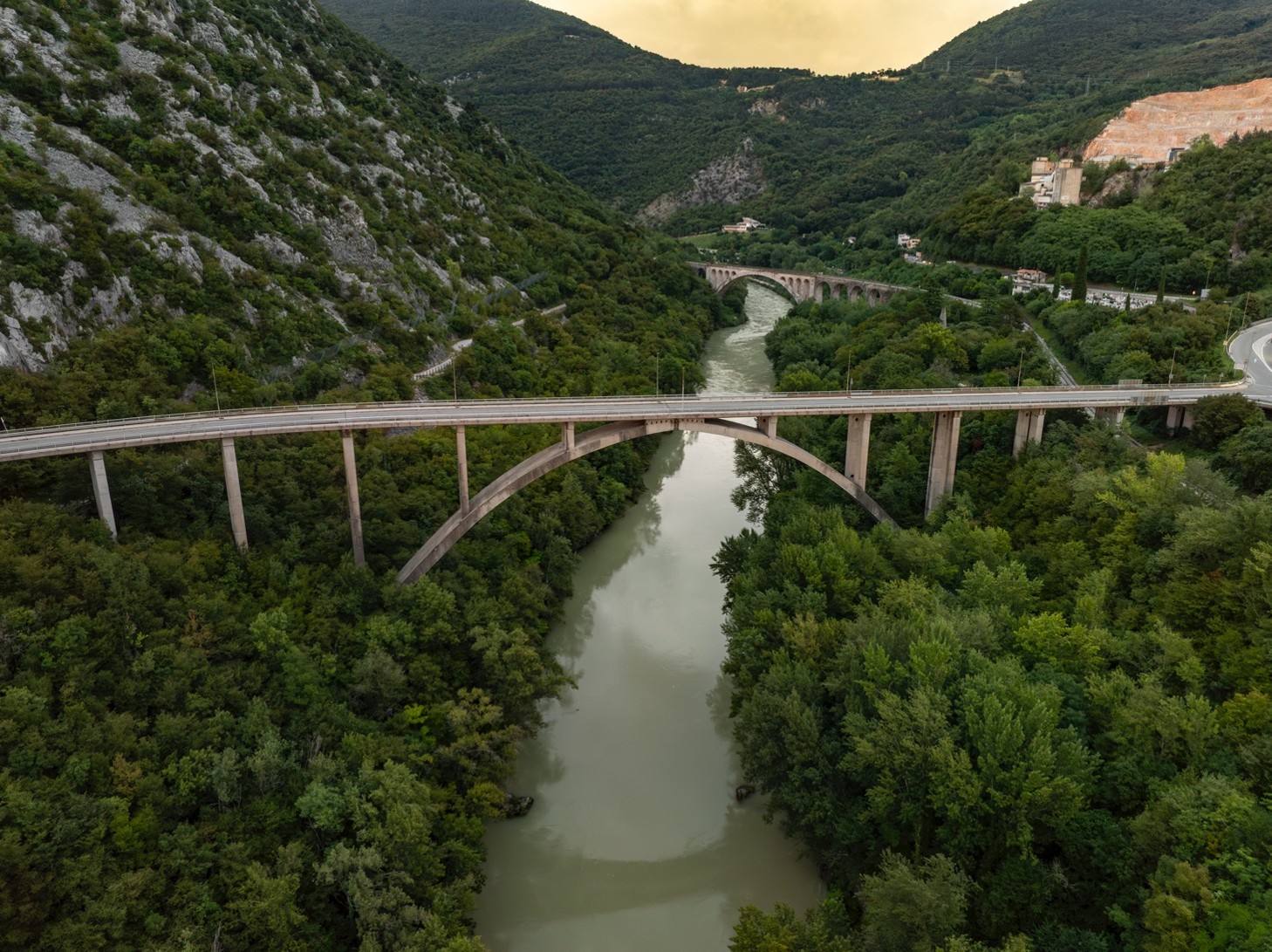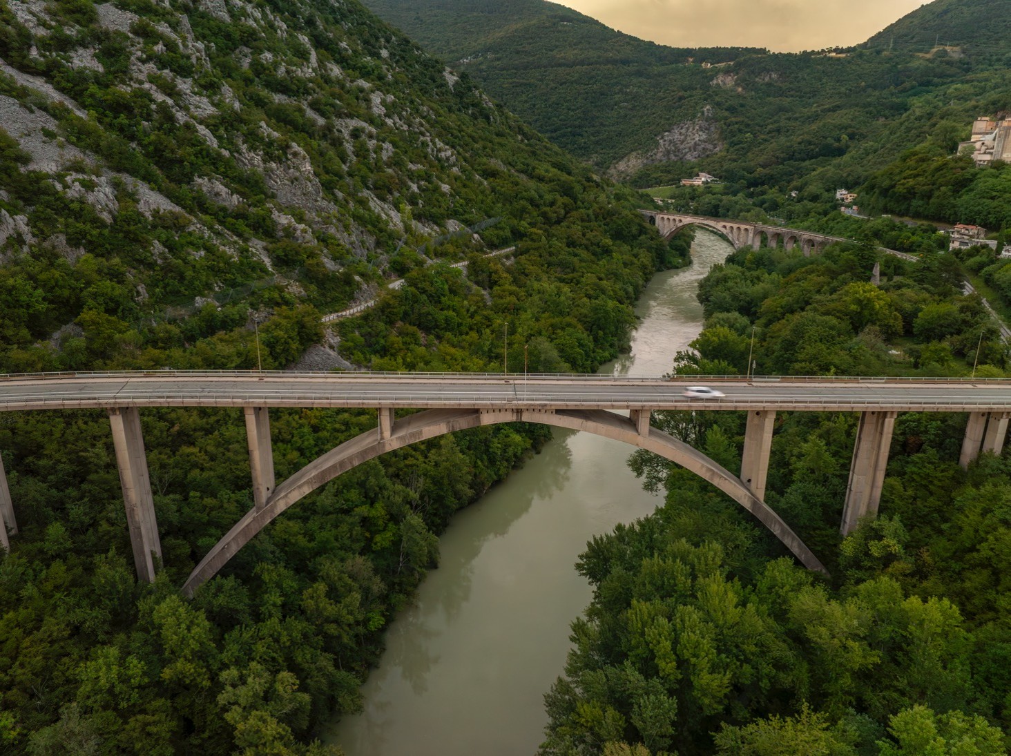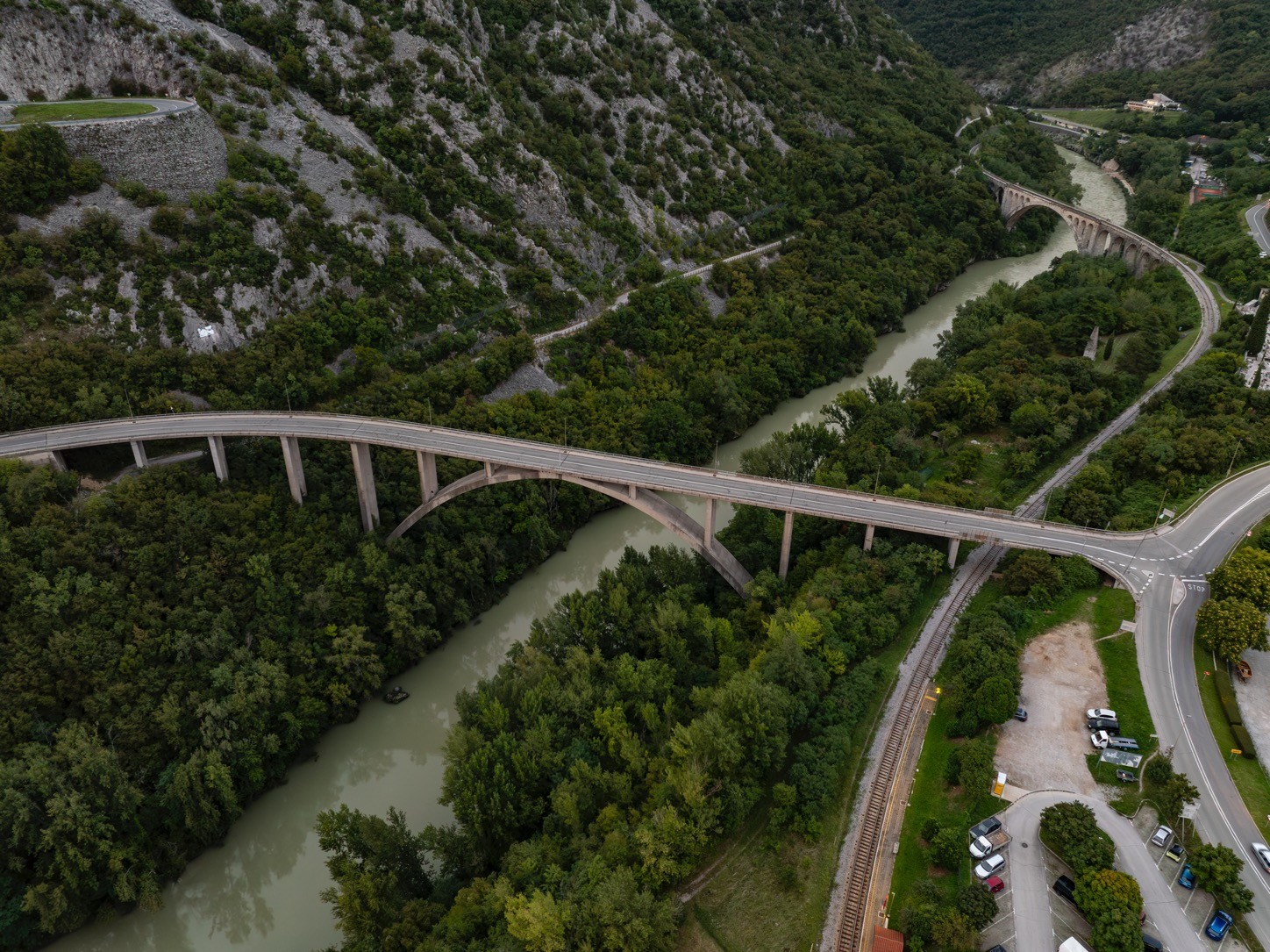 Il 19 luglio 1906 fu inaugurato solennemente il secondo collegamento ferroviario con il porto di Trieste. La nuova ferrovia fu aperta dall’erede al trono austriaco, Francesco Ferdinando, destinato a essere assassinato a Sarajevo nel 1914. Il tratto più impegnativo di questa linea, sulla tratta Jesenice-Gorizia, caratterizzato da 28 gallerie e numerosi ponti era noto come la ferrovia del Bohinj o Transalpina. Tra il 1904 e il 1906, lungo questo percorso, fu costruito il ponte ferroviario di Salcano, dotato del più grande arco in pietra del mondo, con una campata di 85 metri. Fin dalla sua costruzione, il ponte conquistò fama mondiale e ancora oggi detiene il primato tra i ponti in pietra.Subito dopo la sua apertura, la linea ferroviaria Transalpina fu attraversata da un intenso traffico, poiché collegava il prospero entroterra industriale dell’Europa centrale – da Vienna, Boemia meridionale e Baviera – con Trieste, porto strategico dell’Impero austro-ungarico. Con lo scoppio della Prima guerra mondiale e l’apertura del fronte dell’Isonzo nel maggio 1915, la ferrovia cambiò radicalmente funzione. La guerra segnò anche il destino del ponte di Salcano: nella notte tra l’8 e il 9 agosto 1916, le unità del genio austriaco, ritirandosi sulla riva sinistra dell’Isonzo, fecero saltare l’arco del ponte, che crollò completamente nel fiume. Dopo lo sfondamento di Caporetto nell’ottobre 1917, le forze austro-ungariche ripresero rapidamente il controllo della zona e gli ingegneri austriaci avviarono la ricostruzione del ponte. In soli due mesi, fino all’aprile 1918, fu installata una struttura provvisoria a traliccio in ferro del tipo Roth-Waagner, del peso di 650 tonnellate, che permise il ripristino del passaggio dei treni. Sebbene temporanea, questa soluzione tecnica con una luce di quasi 90 metri, aveva il primato tra le strutture portanti provvisorie. Anche negli anni successivi, durante il conflitto, non furono realizzate strutture simili con una campata maggiore.