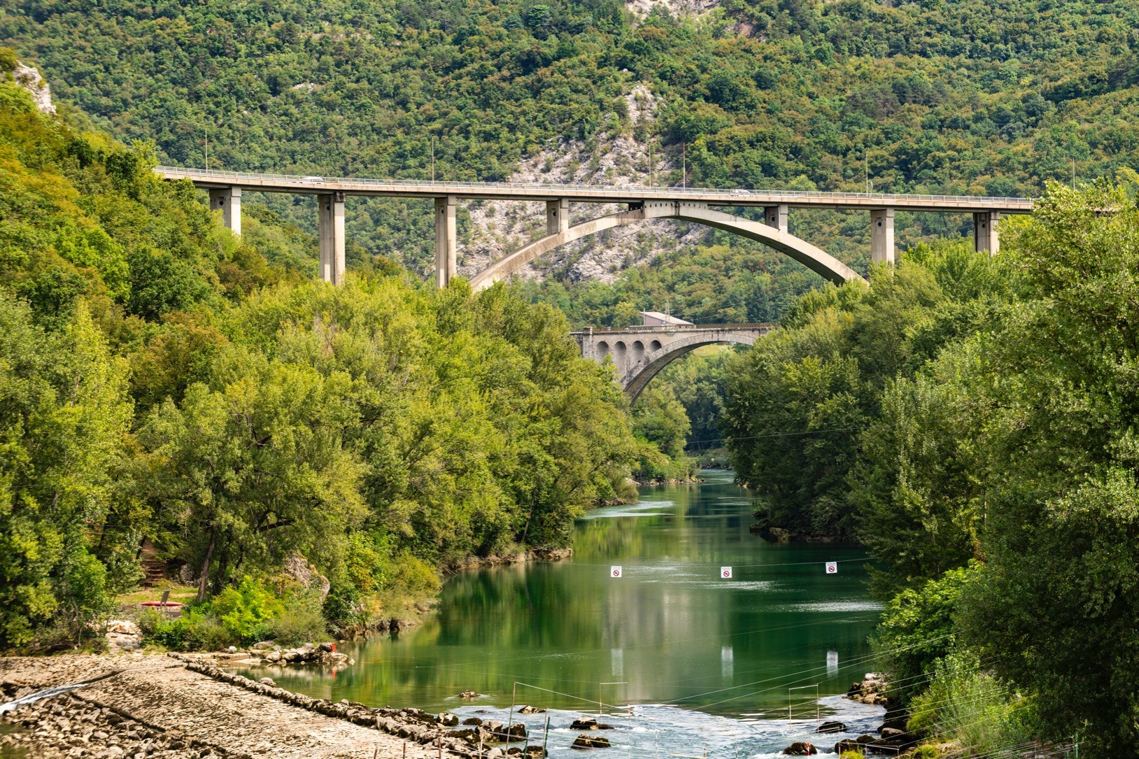 Il ponte di Salcano gode ancora oggi della reputazione di ponte con l’arco in pietra più grande del mondo. Alla fine del XX secolo, in Cina, furono costruite alcune strutture con archi in pietra che raggiungevano i 145 m di luce. Tuttavia, questi archi furono costruiti su viadotti che attraversano valli aride e non richiesero il supporto dell’arco durante la costruzione in acqua, come accadde invece nel caso del ponte di Salcano.Nel 1996, al ponte di Salcano è stata dedicata una monografia dettagliata scritta dall’ingegnere civile Gorazd Humar, dal titolo Il gigante di pietra sull’Isonzo. Dopo anni di ricerche negli archivi di Vienna e in Italia, l’autore illustra tutte le fasi fondamentali della costruzione del ponte, tra il 1904 e il 1906, e della sua ristrutturazione, avvenuta tra il 1925 e il 1927. Nel libro, Humar confronta anche ponti simili in Europa, dimostrando chiaramente che il ponte di Salcano conserva legittimamente il suo primato. I progettisti austriaci hanno dato al ponte di Salcano un’affascinante impronta Liberty, visibile anche dal punto di vista architettonico. Sopra l’arco del ponte fu installata una recinzione in ghisa riccamente decorata con corone di alloro stilizzate, un elemento tipico del periodo. Questa recinzione, progettata originariamente per la ferrovia urbana di Vienna dal celebre architetto Otto Wagner, padre dello stile Liberty viennese, potrebbe aver visto la collaborazione anche del noto architetto sloveno Jože Plečnik. La recinzione in ghisa decorativa del ponte, che si estende lungo il ponte appena sopra l’arco principale, terminava su entrambi i lati della sezione centrale con pali di pietra in stile Liberty. Con l’introduzione del recinto progettato da Wagner, il ponte di Salcano ricevette il sigillo imperiale. Fu infatti l’unico ponte al di fuori di Vienna ad essere adornato con questa particolare recinzione, un dettaglio che ne sottolinea ulteriormente l’importanza. Quando l’arco crollò nel 1916, l’intera recinzione Wagner cadde nel letto dell’Isonzo. Nel 1999 i sommozzatori hanno estratto dal fiume Isonzo i primi resti di questa recinzione, di cui allora non era ancora nota la paternità. Solo nel 2022 l’enigma dell’origine della recinzione è stato risolto e, sulla base dei resti ritrovati, è stata determinata anche l’origine viennese della recinzione e quindi anche la sua paternità. Oggi la recinzione è esposta nel Museo Goriški muzej a Nova Gorica.
