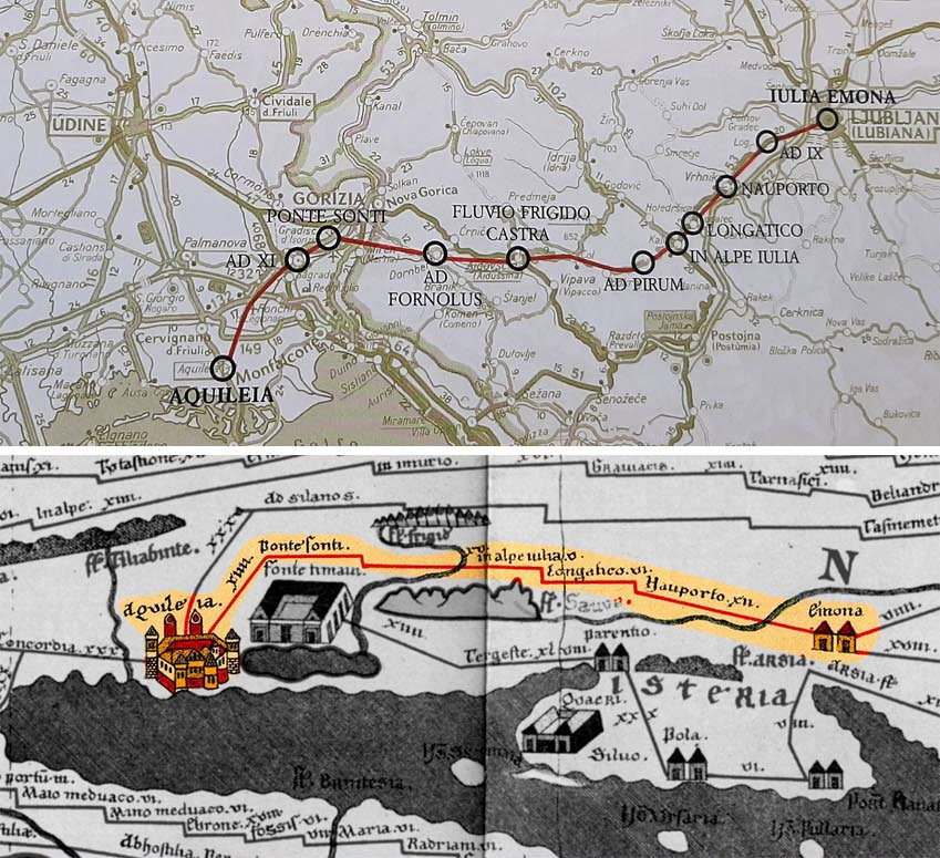 Fig.1 Dettaglio delle tappe salienti della strada romana tra Aquileia ed Emona (Lubiana)