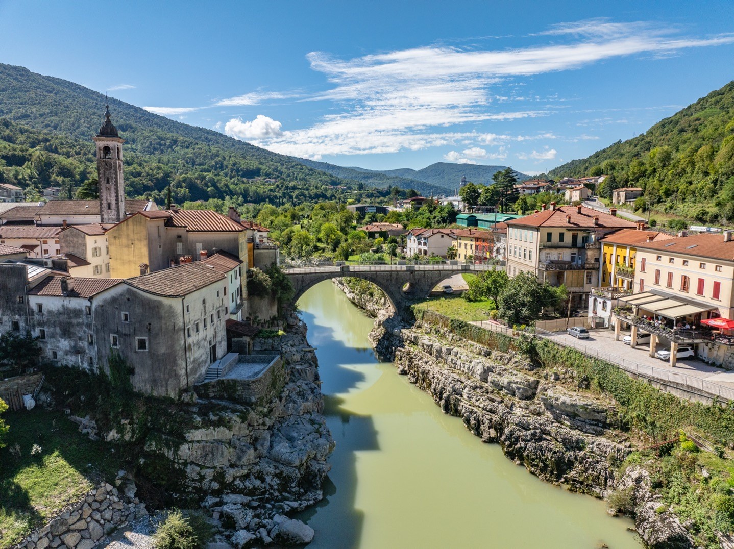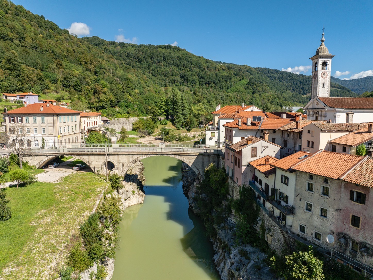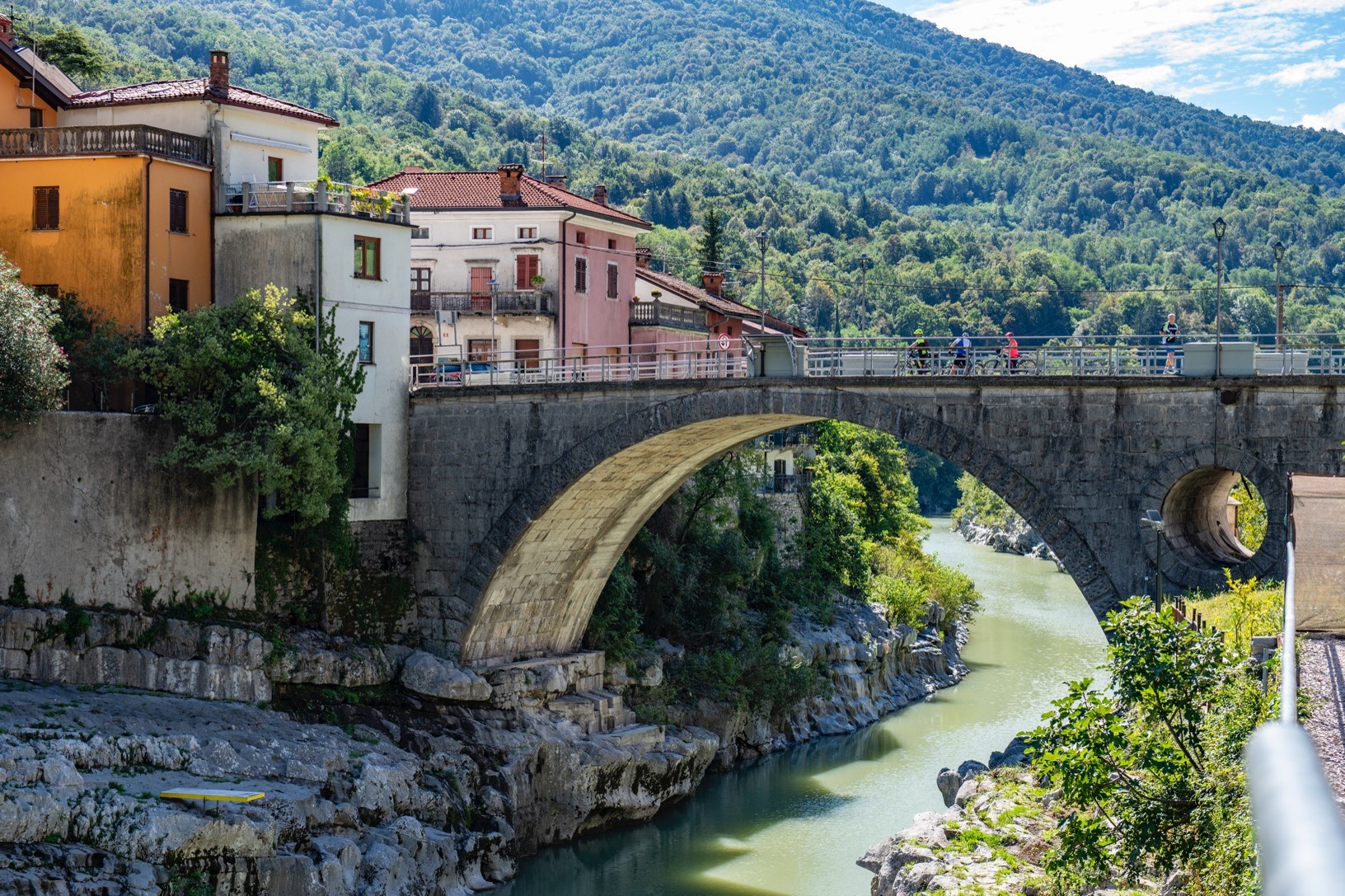 Na mestu, kjer se v središču kraja Kanal korito reke Soče najbolj zoži stoji lep dvoločni kamniti most, ki je eden od simbolov Kanala in daje samemu kraju zaradi izstopajoče lege nedvoumno razpoznavnost. Domnevati bi bilo, da je na tem mestu že v času antičnega Rima stal nekakšen most, a o tem ni ohranjenih nobenih podatkov. Prve omembe mostu v Kanalu segajo v leto 1361, vendar pri tem ni omenjeno ali je šlo za lesen ali za kamnit most. Precej natančneje je most konstrukcijsko opisan v prilogi Jožefinskih vojaških zemljevidov iz obdobja 1763-1787, kjer je most opisan tako (citat): “Čez reko se v enem loku pne eden najlepših in umetelno grajenih mostov iz kvadrastih kamnov; debel je komaj 2 čevlja, širok 9 čevljev in dolg okoli 50 korakov”.Zaradi pomembnosti mostu v vseh pogledih in živahnih trgovskih poti čez most se je Kanal vse hitreje razvijal in postal pomemben lokalni center srednjega Posočja. Leta 1813 je francoska vojska ob umiku iz Ilirskih provinc kamniti most razstrelila. Za takojšnjo obnovo mostu se je najbolj zavzel duhovnik Valentin Stanič, znan tudi kot alpinist in razsvetljenec. Nekateri viri navajajo, da je sam izdelal tako izmere za nov most kot tudi projekt zasnove mostu. Novi kamniti most dolžine 42 m in z lokom razpona 24 m je bil za promet odprt že 4. januarja 1817. Vendar mu usoda ni namenila niti 100 let življenja. Le dva dni potem, ko je Italija 23. maja 1915 napovedala vojno avstro ogrski monarhiji, so avstrijske inženirske enote razstrelile lok mostu, ki je v celoti padel v Sočo. Občinski tajnik Anton Bajt je ta dogodek tako opisal: