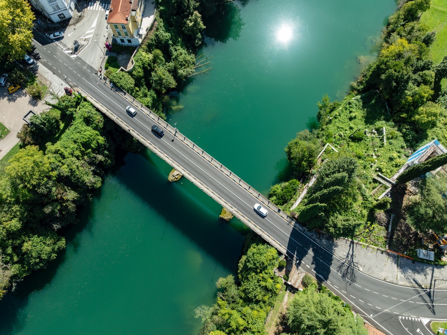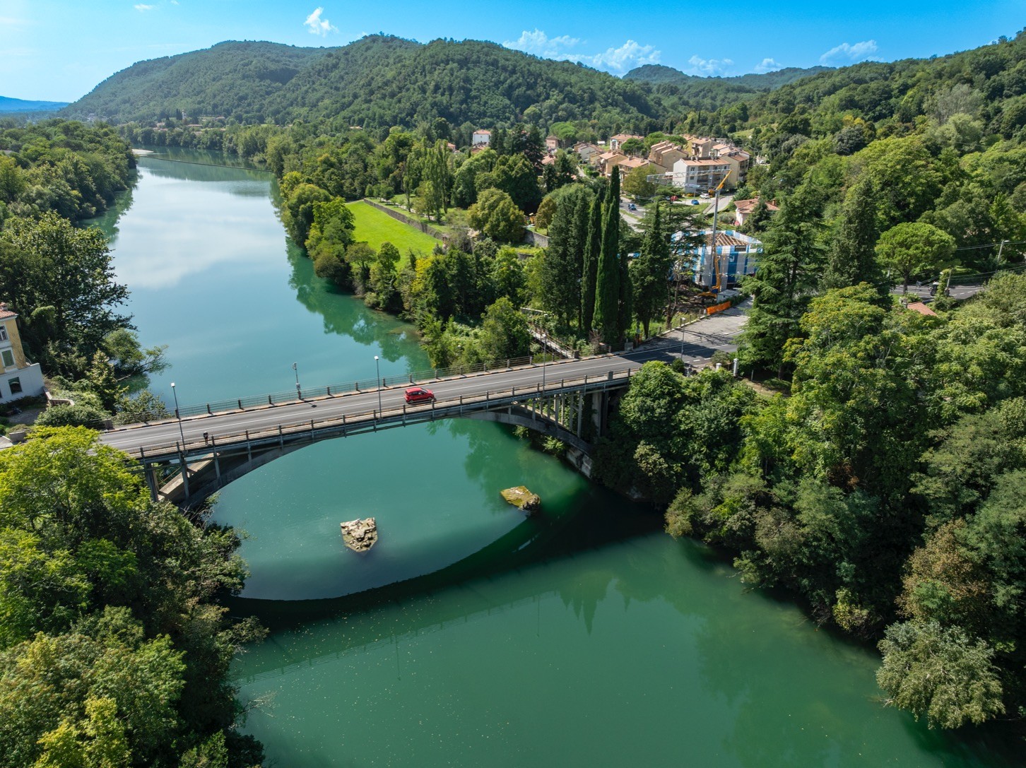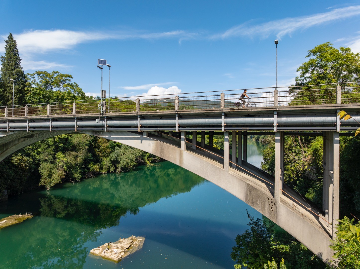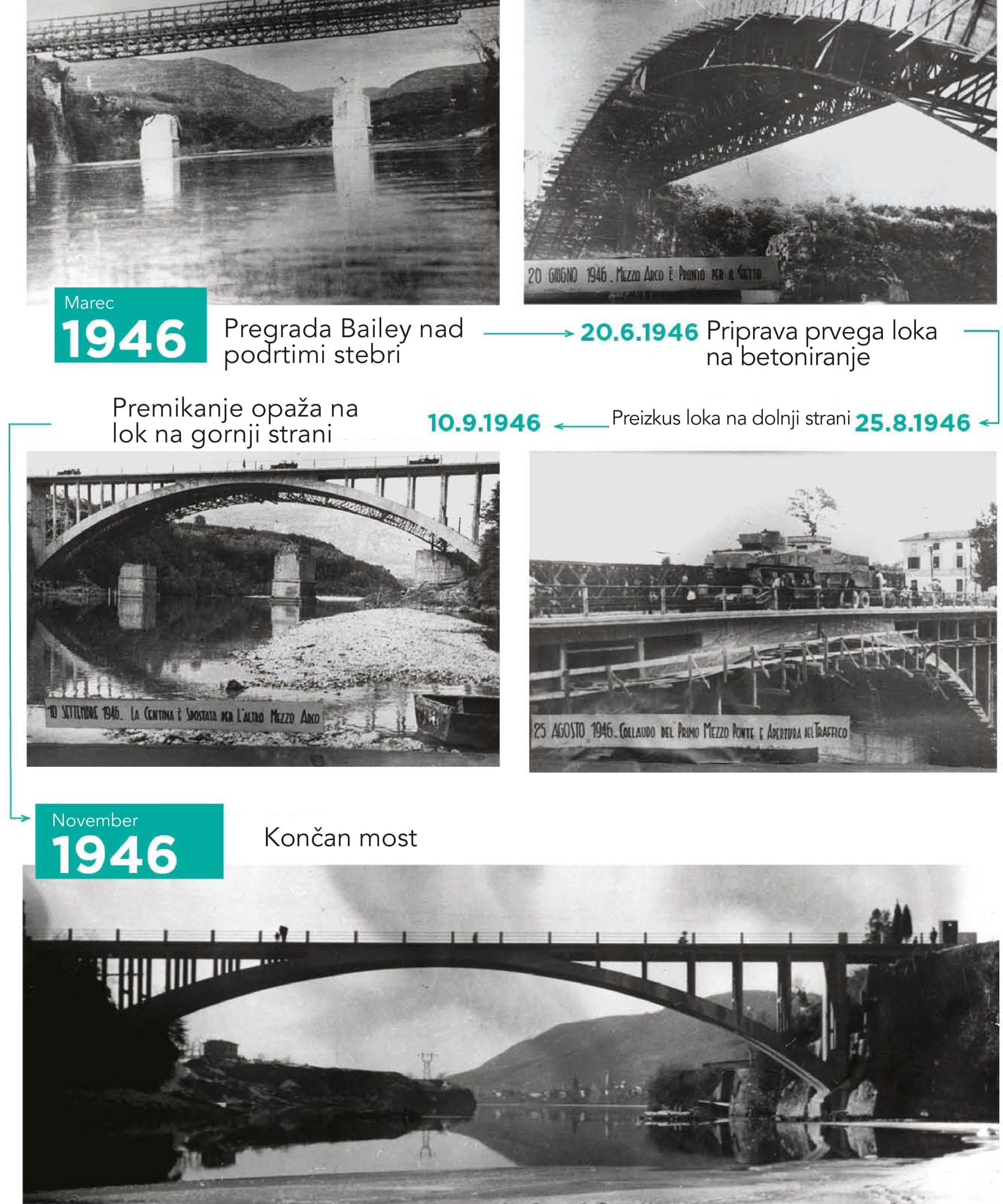 Po koncu 2. svetovne vojne, ko je Gorico prevzela uprava zaveznikov (AMG), je bil uničeni most začasno nadomeščen z mogočno vojaško betonsko pregrado Bailey, zasnovano kot en sklop, ki je povezoval razdaljo med dvema bregovoma v dolžini 60 metrov. Na začetku leta 1946 se je uprava (AMG) odločila za obnovo mostu v obliki loka. Vzporedna loka sta bila narejena iz betonskih škatlastih elementov, povezanih med seboj v zgornjo nosilno konstrukcijo. Gradnjo je izvedlo podjetje Rizzani S.A. iz Vidma (Udine) po načrtih inženirja Marija Crespija. Dela so bila izvedena v zelo kratkem času. Začeli so aprila 1946, ker pa so uporabili poseben jekleni opaž je bil prvi lok zaključen že konec julija.26. avgusta 1946 je bila prva polovica mostu preizkušena z vožnjo nekaterih težkih vojaških vozil (med drugim tudi tanka s težo 62 ton). Kmalu zatem je bil končan drugi lok katerega preizkus vzdržljivosti je bil opravljen 6. novembra 1946. Leta 1974 je Občina Gorica ponovno povabila inženirja Crespija, da preveri stanje mostu, pri čemer se je izkazalo, da je struktura mostu še vedno v odličnem stanju in zelo varna.